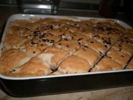 Изсипваме в намаслена и набрашнена тавичка описаната току що смес за блата и слагаме да се пече в загрята на 180-200 градуса фурна. Печенето отнема около 35 минути, но най-сигурно се проверява на принципа на извадената суха клечка.
