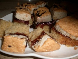 Когато блатът е вече опечен, вадим тавата от фурната и намазваме върху блата сладкото (от сини сливи или вишни). Тук, освен сладкото, по желание можете да добавите натрошени орехи или филирани бадеми. Въпрос на вкус. Върху сладкото разстилате и белтъчения крем и връщате сладкиша обратно във фурната за още 5 минутки, колкото белтъците отгоре да придобият приятен, златист вид.