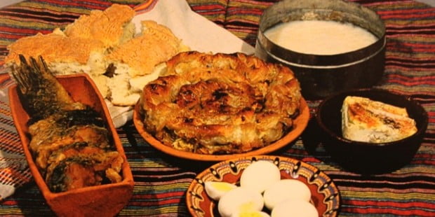 Трапезата е от пържени яйца, кисело мляко, баница с праз лук, кисело зеле, лапад, спанак. Също така риба, рибник, а десертът е баница с ябълки и орехи, сутляж, печени ябълки. Хлябът не е обреден. Трапезата не се кади.